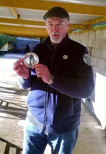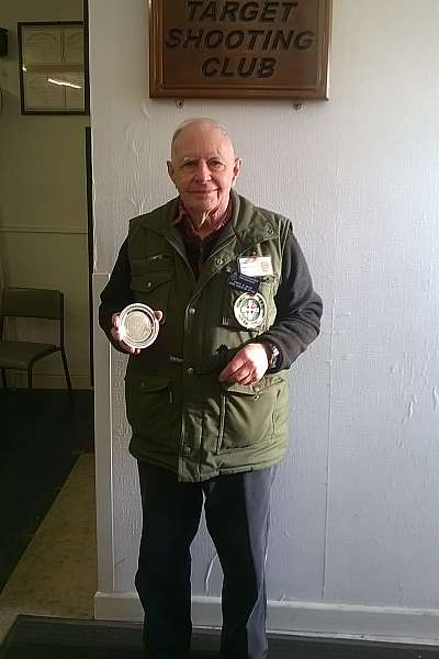Ernie Bryer and his trophy for winning the Hendon League 25mtr Gallery rifle open sights Division 4, Summer 2014