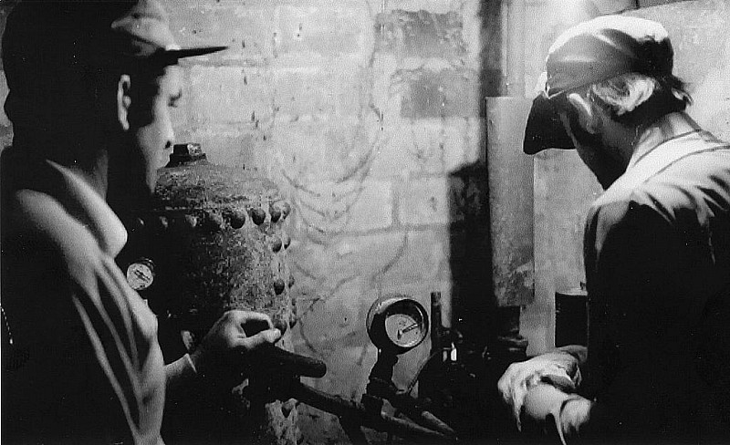 1972c - A set of turning target frames that were originally used for the 1948 London Olympics Rapid fire Pistol event were acquired from Bisley and installed on the river range. Compressed air was needed to operate the turners and this photo shows Bill Phelps and Gary Hellstrom about to start the Donkey engine compressor that was housed in a small shed behind the stop butt wall.