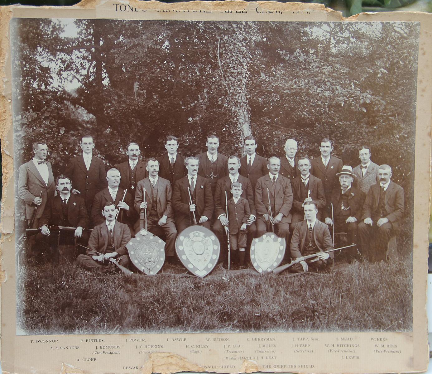 The Photograph is titled TONDU MINATURE RIFLE CLUB 1914 and has been framed and hung in the club house where it can be studied closer. The photo is believed to be the actual one mantioned in the report printed in the Glamorgan Gazette on the 24th July 1914 and it can be seen on the club History page.