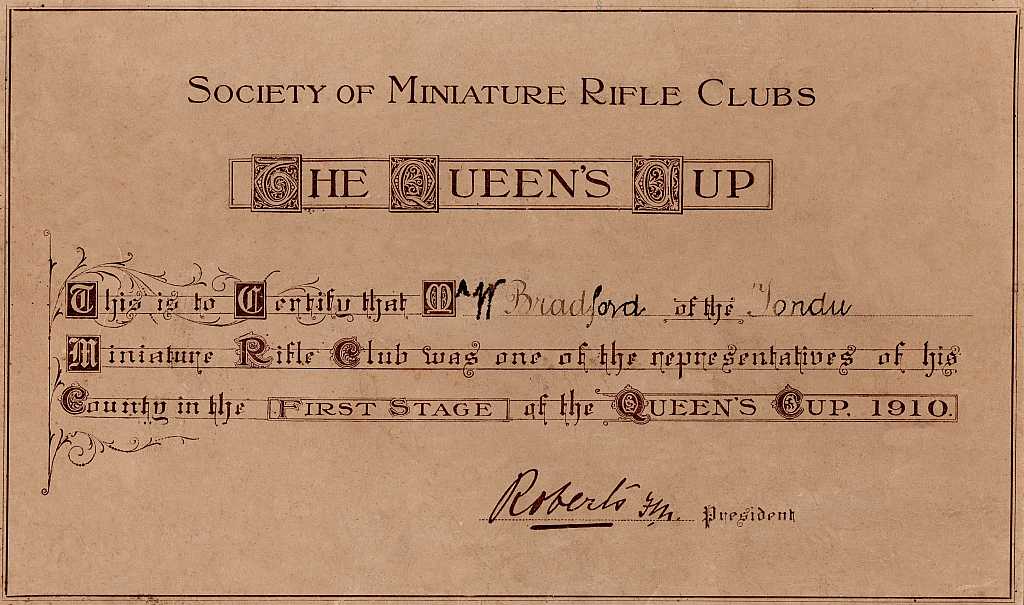 The text "This is to certify that W. Bradford of the Tondu Miniature Rifle Club was one of the representatives of his County in the first stage of the Queen’s Cup 1910." W Bradford shot in the first stage of the 1910 competition and where he finished in the rankings amongst the Glamorgan shooters is unknown - the first 6 made up the Glamorgan team for the next stage, with Mr Barrow-Evans, who came 7th, making up the place of Mr A.A.Saunders who was disqualified on a technicality.