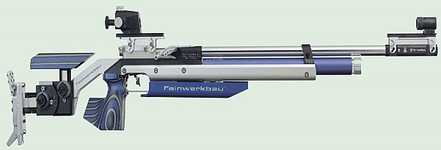 The Feinwerkbau - FWB 700ALU series was introduced in early 2003 and represented the state of the art in precision 10 metre target 4.5 mm (.177 inch) air rifle shooting. It is an air gun which is charged from a compressed air source, such as a diver's air bottle. The cylinder under the barrel is charged to 200 bar (about 3000 psi) and can power the gun for about 180 shots before refilling. Having the gun operated by compressed air means that it is less tiring for the user over the usual 60 shot course of fire. The Rifles have a large range of adjustments available to fit the gun to the user.(Feinwerkbau translates from the German as: "Fine work company")