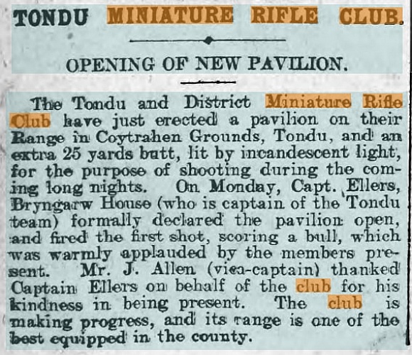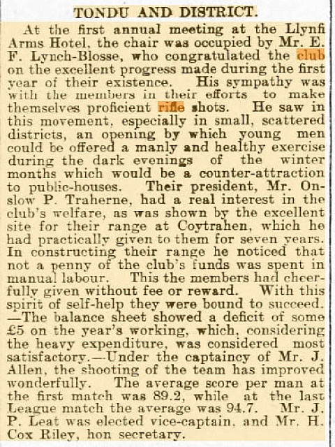 Glamorgan Gazette report of the first annual AGM after the re-naming of the militia as the Tondu & District Minature Rifle Club.