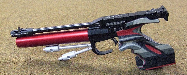 The first photo is of a Feinwerkbau model 40 compressed air 4.5mm air pistol showing one of the often quite gaudy colour schemes that are in the current fashion for the target sports. The red tube under the barrel is the compressed air cylinder and this can be easily unscrewed for recharging from (normally) a diver's air bottle. Fitted into the end of the tube is a pressure gauge to show the contents. Under the air cylinder are the balance weights, which can be moved to suit the shooter's preferences. These guns are highly adjustable to suit individual requirements and they do not come cheap.